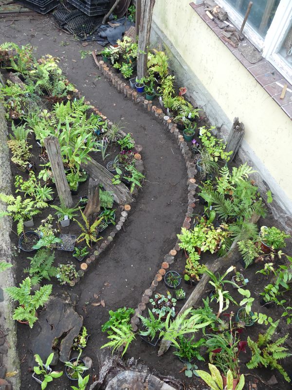 Anschließend habe ich die Erde modelliert, rechts hinten einen Robinienabschnitt als Trittstufe hinter das Gewächshaus gesetzt und dann die Töpfe ausgestellt, während immer wieder mal ein Regenschauer drüberhuschte. Über das Jahr hatte ich öfter was dazugekauft, mit dem Hintergedanken, dass es gut in dieses Beet passen könnte. Nun ja... es wurde kuschelig. ;D