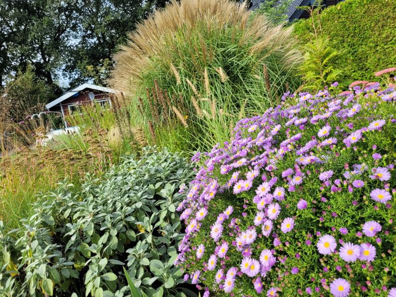 Im Steppenbeet wurde einiges - wie Helenium- bereits herunter geschnitten und leider hat sich eine Maus hier eingenistet... und eine der weißen Hems fast weggefressen... grrrrr. :-X