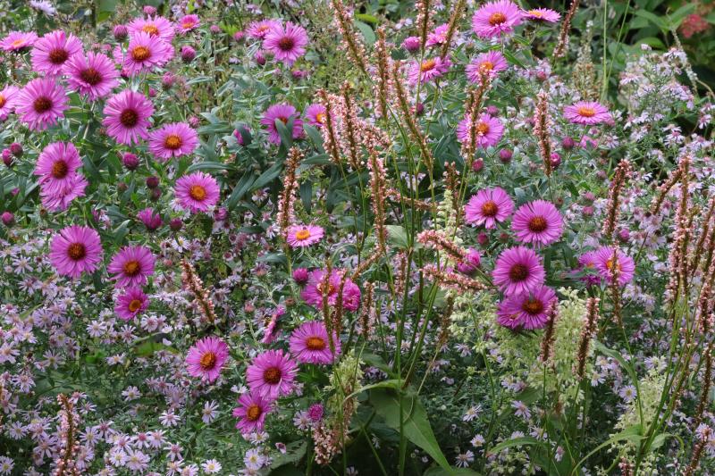 So schön sie sind, Aster novi- belgii benutze ich nicht mehr: unmäßige Ausläufer und Versamung, nach ein paar Jahren verdrängen die Sämlinge die Sorten und alles blüht verwaschen hellviolett. Ich rate diese Astern nicht aussäen zu lassen! Oder nur eine Sorte, dann funktioniert es
