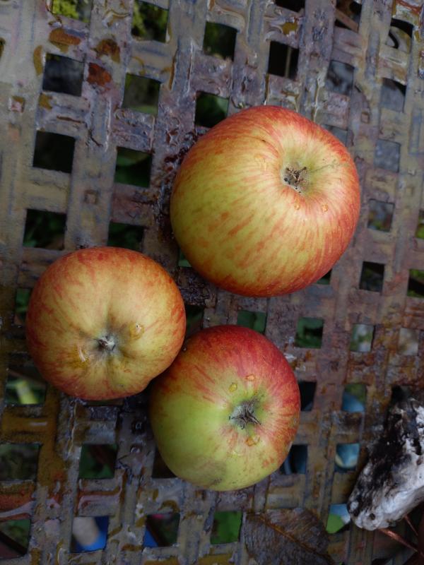 Ganz links der Säulenapfel Ciepa, in der Mitte Blue Moon.