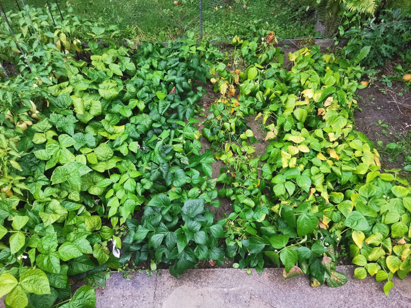 Erst alle Bohnen im Regen verfault, noch im Mai nachgelegt, dann die mysteriöse Welke, bei einigen Sorten Totalausfall, der Rest ist gewachsen. Aber kaum Fruchtansatz. Jetzt im September, lauter kleine Vanillekipferl an der Pflanze.