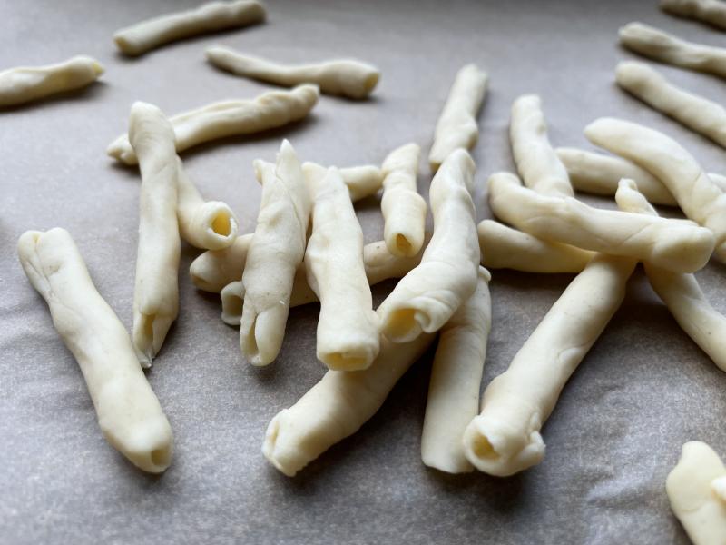 Hmmm! Ich kann es nur empfehlen! Die sind wirklich super geworden! :D Im Rezept stand auf 400 g Hartweizengrieß, 200 ml Wasser und ein halber Teelöffel Salz. Ich habe etwas mehr Wasser genommen, aber man merkt schon, wenn der Teig richtig ist.