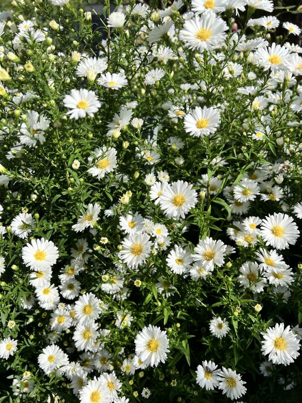 Wir haben im Vorgarten zwei tolle Pflanzen einer weißen Asternsorte, von der ich leider den Namen nicht weiß. Aber sie blüht zuverlässig wunderschön jedes Jahr.