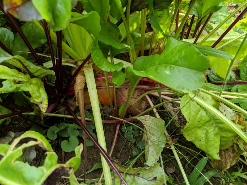 Dann kommen ein paar leere, nur gemulchte Beete - da standen die Kartoffeln. Wegen des späten Starts und des trockenen Frühsommers hatte ich befürchtet, dass die Ernte miserabel wird, war sie aber nicht. Knapp zwei Zentner Linda und Adretta sind im Keller. Die Asia-Senfkohle sind gesät und gekeimt, aber noch zu klein, um auf dem Bild erkennbar zu sein. Die verschiedenen Radicchio stehen gut und werden beerntet. Den Gurken habe ich nach einem heftigen Mehltaubefall ein Großteil der kranken Blätter entfernt, sie haben sich erstaunlich gut berappelt und tragen wieder. Im Hintergrund wachsen Knollensellerie, Mais, ein paar Auberginen und Zucchetta ...