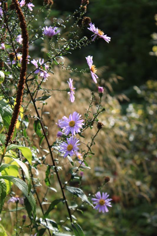 Wie würde Dir denn diese Aster mit zierlichen, zart lavendelfarbenen Blüten gefallen, die hier gut mit Trockenheit klar kommt und auch etwas halbschattig stehen mag: