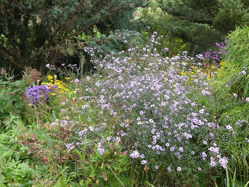 Beim den Glattblättrigen, welcher Art auch immer, gefallen mir mittlerweile die Halbwilden aus der Landschaft oder alten Gärten am besten. Diese Pflanze hat ungefähr so große Blütenkörbchen wie Gänseblümchen, welche je nach Licht und Temperatur mal bläulich, mal rosig schimmern. Dazu viele gute besetzte Stiele. Sitzt an etwas frischerer Stelle und wächst dort mehr als gut. Die Mutter oder Großmutter davon habe ich mal von einer Feuchtwiese geholt, wo sie einen großen Bestand bildeten. Bevor sie einer der zahlreichen Folgebaustellen für ein vorgebliches Bahnprojekt weichen mussten.