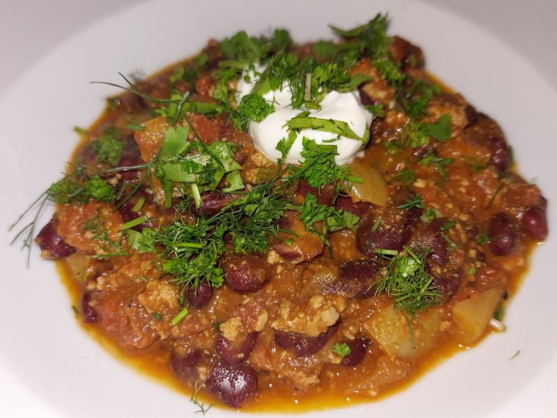 Chili sin carne mit Schmand und Kräutern, Baguette und Zuckerhutsalat