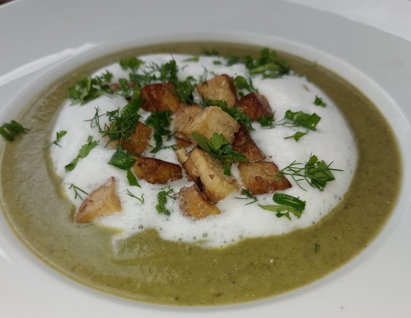 Zucchini-Mangold-Suppe mit Milchschaum und gebratenem Tofu, dazu Salat aus verschiedenen ⅘Blattsalatresten