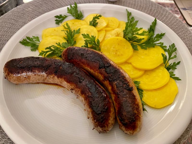 zwei verschiedene grobe bratwürste vom wochenmarkt mit salat von gelben randen
