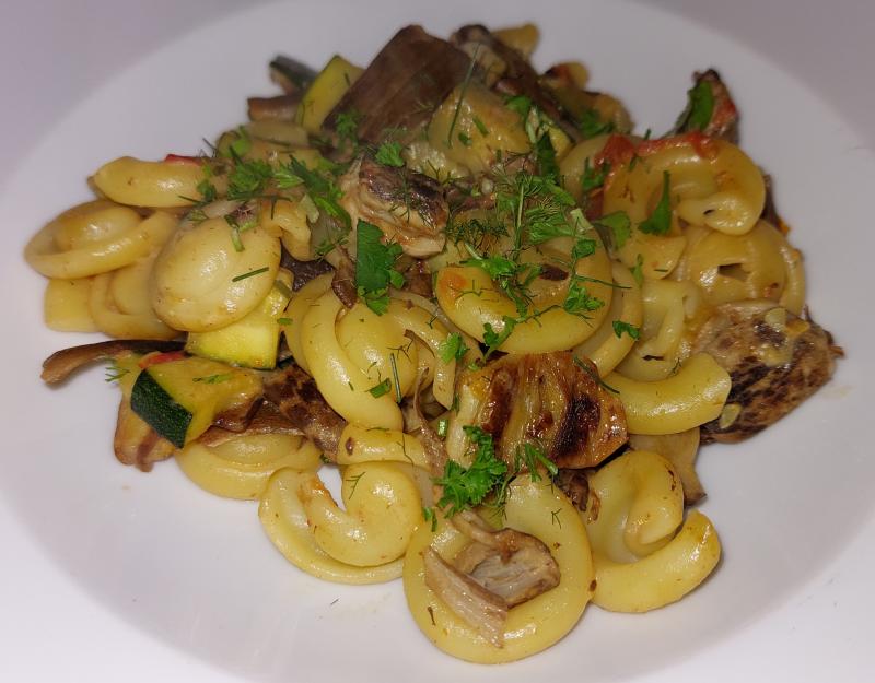 Pasta mit gebratenen Parasolen, Zucchini, Tomaten und Knoblauch, Gurkensalat