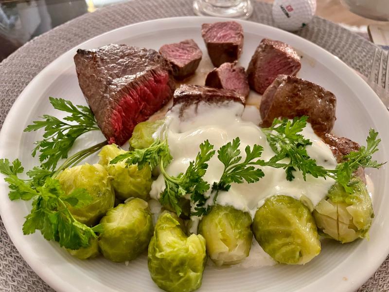 Gestern nur ein bißchen Wurst und Käse mit Knäckebrot, heute Lammfilet mit Zuckerschoten und Schwenkkartoffeln.