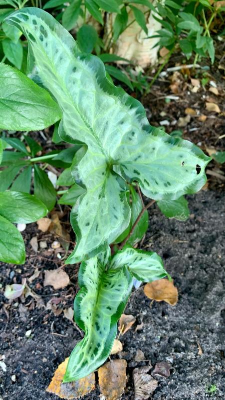 und ‚Milk and Honey‘ von Gert Geensen. Es ist eine zierliche Hosta des Winters. Drei Arum von Gert Geensen stehen bei uns im Garten: ‚Milk and Honey‘, ‚Hungarian Rapsody‘ und ‚Bella Italia‘. Alle drei unterscheiden sich sehr gut von den anderen Arum. Sie zeigen ein einmaliges Blattmuster.