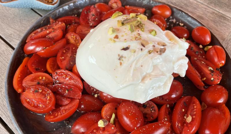 Büffelburrata auf Pomodorini di sardegna und kleinen Amorgostomaten mit Pistazien und geröstetem Brot. :)