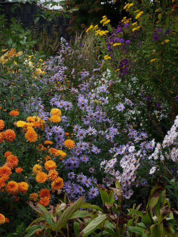 Noch vor dem Regen : PottPurli verschiedner Astern ( Rosa Sieger, Myrthenaster, Alma Pötschke, Mönch ( mit Chysantheme Clara Curtis ), zwei Sämlinge