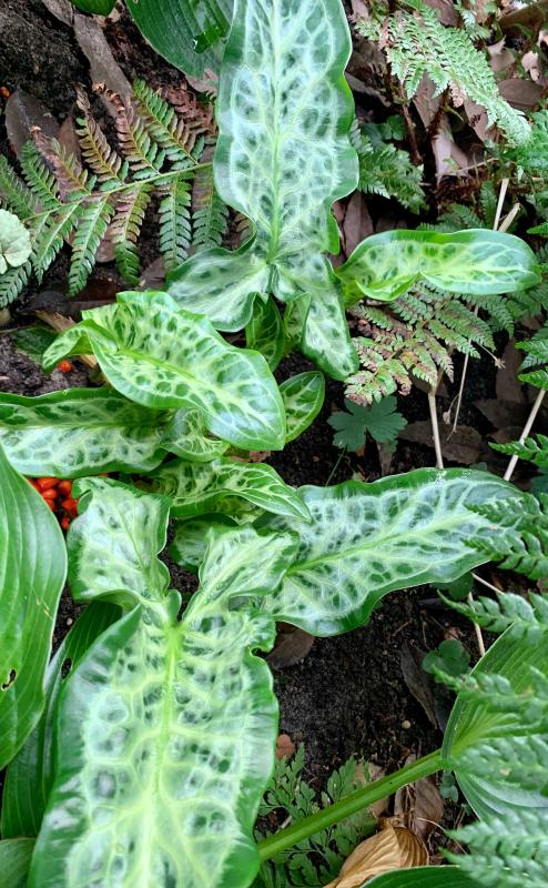 und ‚Milk and Honey‘ von Gert Geensen. Es ist eine zierliche Hosta des Winters. Drei Arum von Gert Geensen stehen bei uns im Garten: ‚Milk and Honey‘, ‚Hungarian Rapsody‘ und ‚Bella Italia‘. Alle drei unterscheiden sich sehr gut von den anderen Arum. Sie zeigen ein einmaliges Blattmuster.