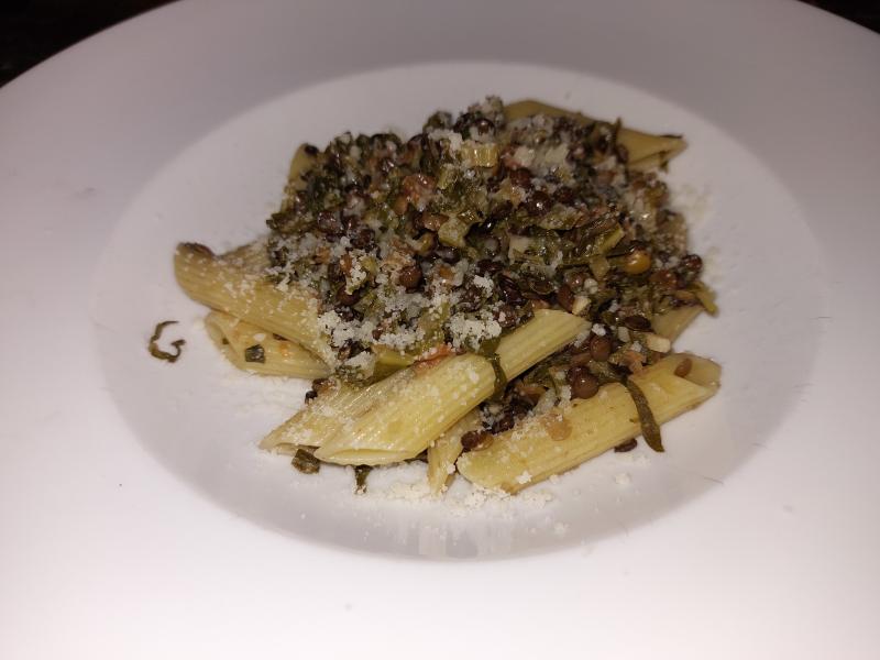Und heute gab's Penne mit Chinakohl, Belugalinsen, Tomaten und Parmesan, dazu Zuckerhutsalat