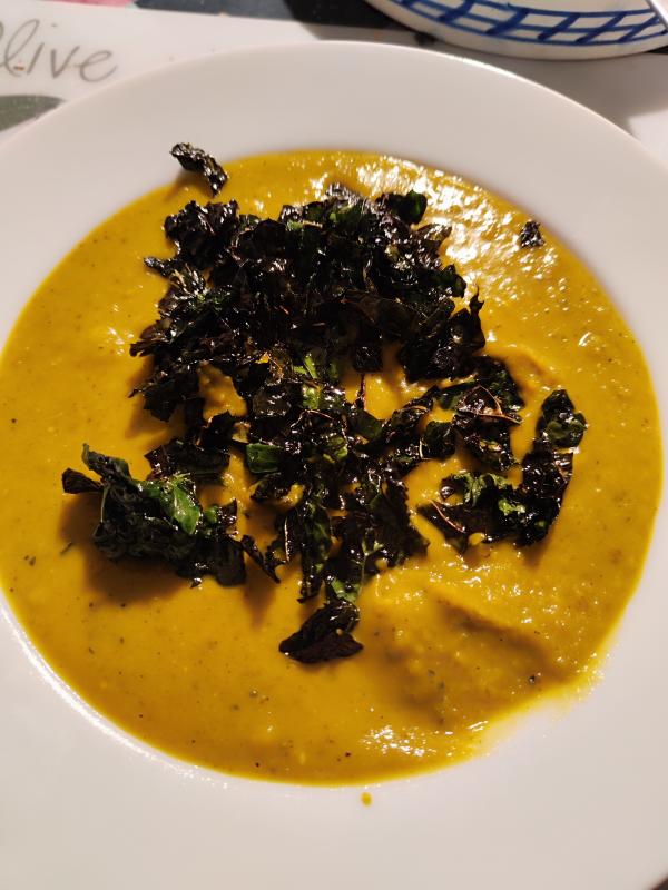 Ich ziehe ja Kürbis auf Kompost oder vor sich hin rottenden Wiesenschnitt, der zwischen Estrichgittern aufgehäuft wurde. Nun hatte sich ein grünschaliger Hokkaido darin festgeklemmt. Gestern wurde er herausgeschnitten und heute gleich zu einem Cremsüppchen verarbeitet. Als Topping kam frittierter streifig geschnittener Schwarzkohl (Nero di Toscana) dazu. Limettensaft zum Kürbis machte sich übrigens richtig gut.