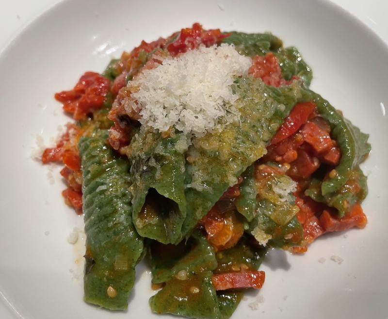 Aber dann gab es doch die Pasta all'ortica mit Tomaten und Salsiccia. Darüber Peccorino Sardo. Ich hatte vergessen, dass ich den Teig für die Pasta dünner gemacht habe, deshalb sind sie etwas aus der Form. Geschmacklich tat es aber keinen Abbruch.