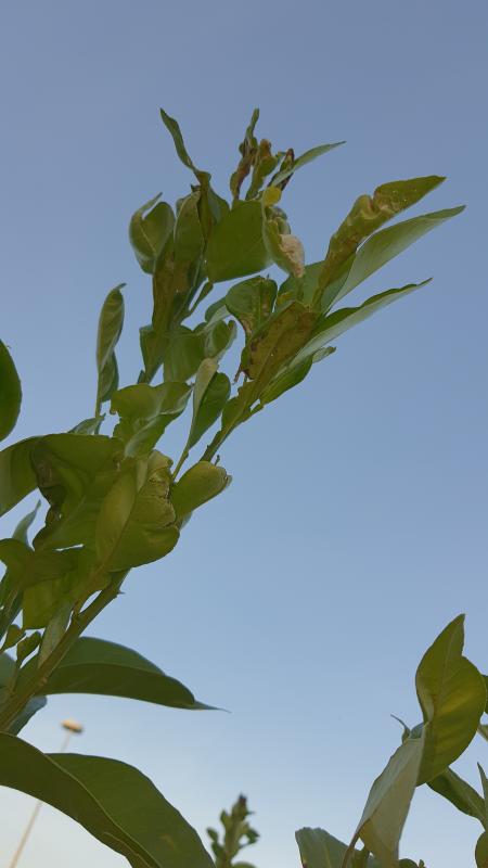Leider haben diese Zitronenbäume alle Schäden an den Blättern - aber nur an den Triebspitzen, die anderen Blätter sind in Ordnung. Die Blätter kringeln sich und werden teilweise gelb.