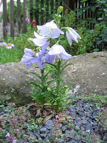 Hallo, hier bin ich wieder! Habe nur "eben" mal ein Thymianbeet fabriziert, dass die Leute mal kapieren, dass diese auch trittfest sind.Bei gezeigter Glockenblume handelt es sich tatsächlich um C.persicifolia f. nitida! Ein Schweizer Gärtner hat zwei Auslesen benannt, und zwar die weiße Form 'Campiello' und die blaue 'Bajazzo'. Sie sind aber nichts weiteres als die oben benannte Form. Durch Aussaat lassen sie sich nicht vermehren, man bekommt dann normale C.persicifolia in allen Höhen, wie man es sich wünscht. Also nur durch Rosettenteilung vermehrbar, was entsprechend langsam vonstatten geht. Hübsch für Tröge! Bin erst am späten Abend wieder erreichbar, ich gehe nämlich mit der Familie ins Theater zu "Carmen", nicht etwa in die Zauberflöte!!