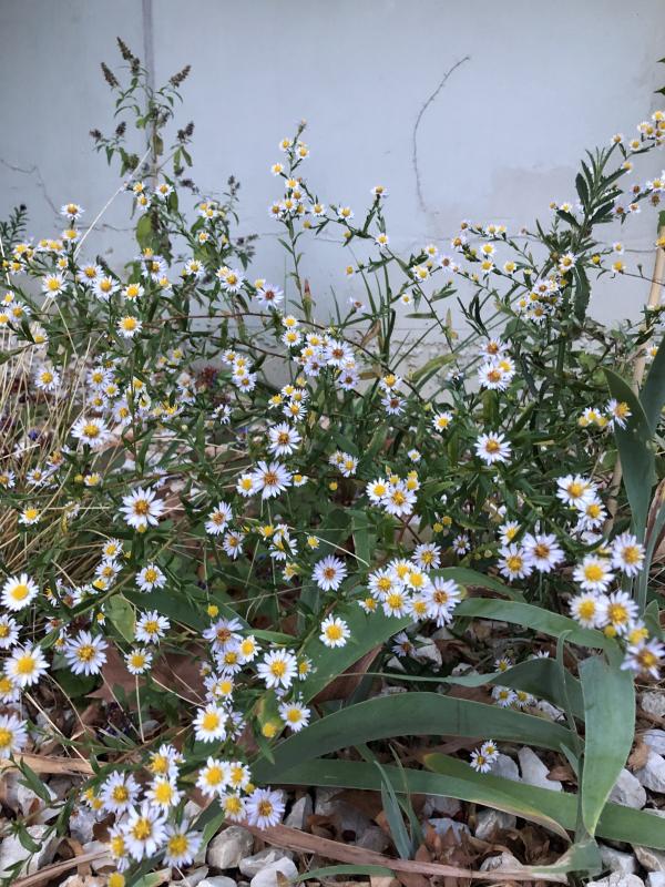 Aster ‘Oktoberkaskade’ ist er’s in zweiten Jahr. Luftige Erscheinung. Steht hier sehr trocken und ist sehr gesund.
