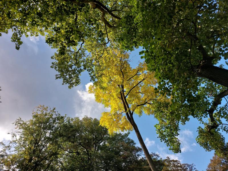 Dann habe ich den Baum doch gesehen. Da stand noch ein extrem hoher Baum, der bis in große Höhe keine Äste mehr hatte und oben eine recht kleine Krone mit Blättern, die bereits komplett leuchtend gelb gefärbt waren und aussahen, wie eine Esche....