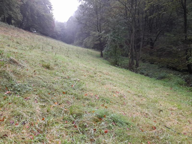 Ich bitte hier auch noch mal darauf zu achten, dass eine Grasnarbenverletzung nicht stattfindet. Hier Blick auf das bereits abgehütete Stück. Es wird nicht unter die Grasnarbe beweidet! Pufferzonen zum Gewässer: Schafe meiden Wasser wenn es irgend geht. Ob das vielleicht nicht sogar von denen aus übertrieben ist, können wir denen nicht vorschreiben. Aber wer hier im Forum schon mal versucht hat Lämmer über den Bach zu bringen, der kichert hier hemmungslos. Ergo. Wenn es sein muss frisst man am Bach. Um kaum damit fertig sofortigst nach oben zu klettern. Dort hat man trockene Füßchen und den totalen Überblick. Was dazu führt dass oben abgeköddelt wird. Es sind also keine Rinder oder Wasserbüffel, denen -zumindest Letzteren - Matsch so richtig gelegen kommt. Es sind auch keine Tränkestellen am Bach. Der Maurerkübel steht da ehrlich gesagt zur Zierde. Die haben im Moment keine Leckmasse. Da wird im Herbst nicht getrunken. Das Gras ist so nass...