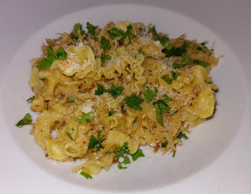 Heute gab's wieder zu Hause Pasta mit gebratenem Sauerkraut und Parmesan, dazu Zuckerhut