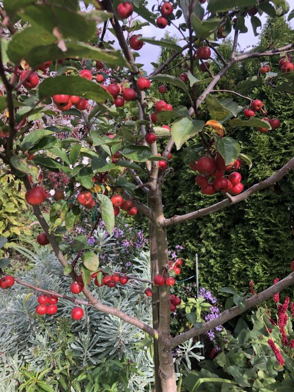 Die Kupferfelsenbirne ist diesmal noch allein, Glyzinie und Pfirsich im Hintergrund beginnen erst.