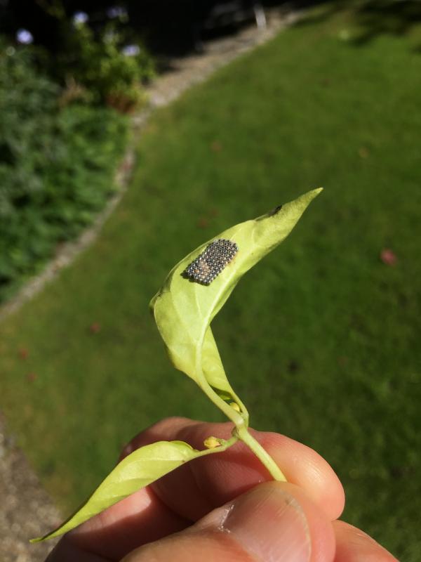 Leider! Es war ein Schock für mich und bedeutete, zig mal am Tag nach den Viechern und deren Gelege .. hier unter einem Blatt der Pimiento de Padrón zu sehen