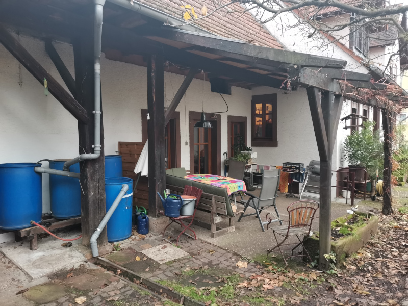 Regenfasslösung, man hat immer was für die Gießkanne und der Überschuss wird abgeleitet, in diesem Fall in eine alte Jauchegrube.