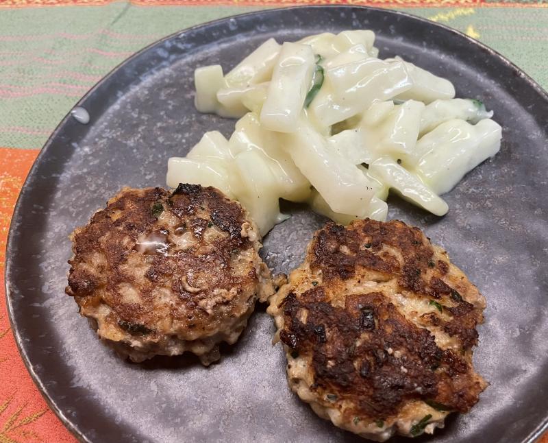 Hier gab es heute ein Schlemmeressen aus dem Ofen: Kartoffeln, dünne, leicht angebratene Schweinefiletscheiben, Wirsing mit Petersilie und Emmentaler. Köstlich. :D