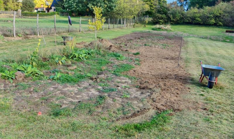 Neben ein paar Topfereien, Rasenmähen und dem Pflanzen von zwei Päonien habe ich dieses Wochenende vor allem Erde bewegt. Wo die abgeschobenen Grassoden zu liegen kamen, ist es recht mühsam. Ein guter Teil der ca. 400 m² ist aber geschafft, danach kann es endlich ans Pflanzen der Hecke und anderer Gehölze gehen. Bei der Gelegenheit habe ich auch den Berg Grassoden verteilt, der sich bei den Beetanlagen der letzten anderthalb Jahre angesammelt hatte.