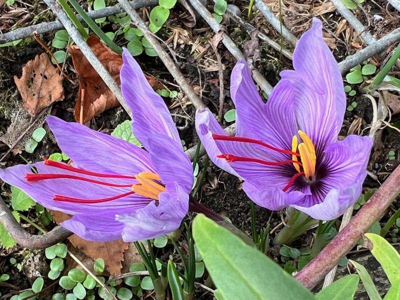 Safran-Krokusse auf einer Grünfläche zwischen den Fahrbahnen in München.