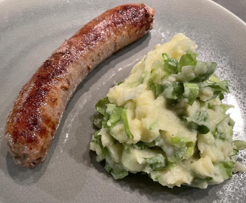 Heute ein übersichtlicher Teller: Endivien untereinander mit Bratwurst von glücklichen Schweinen.