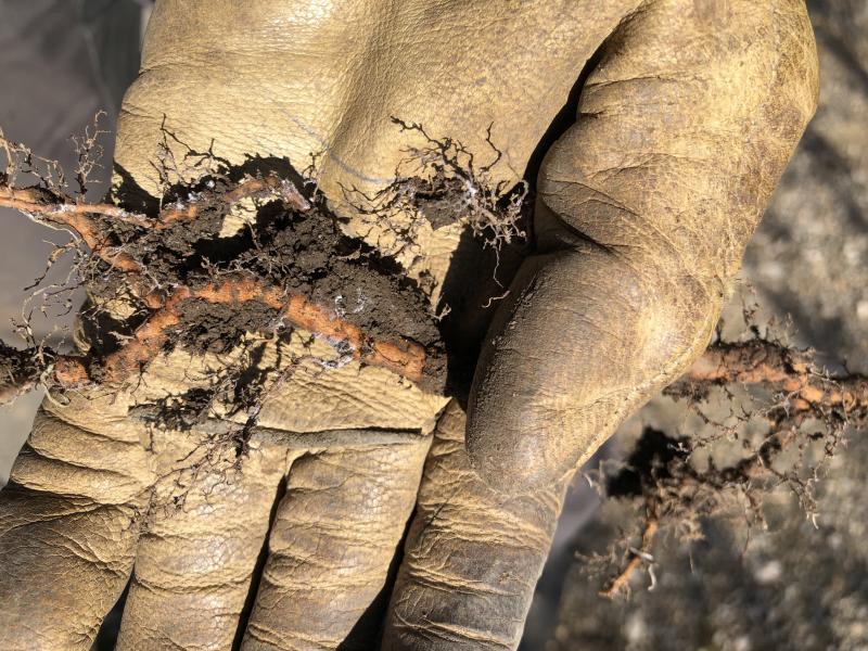 Sieht für mich eher nach den Wachsausscheidungen von Wurzelläusen aus.