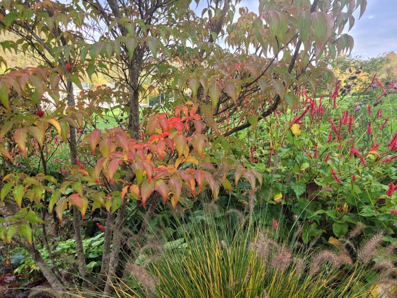 OK, dann zeige ich einfach mal Cornus 'Milky Way', der nun auch mit der Herbstfärbung beginnt...