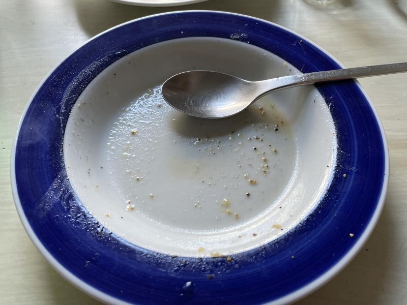 Gestern hatten wir Frühstücksbesuch. Das war wie immer eine Völlerei. Abends gab es deshalb im Biorestaurant nur einen Salat mit Ziegenkäsetaler.