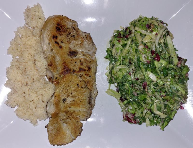 Gebratene Parasole mit Dinkelcous und verschiedenen Blattsalaten (Zuckerhut, Chinakohl, Radicchio und Frisée) aus dem Garten