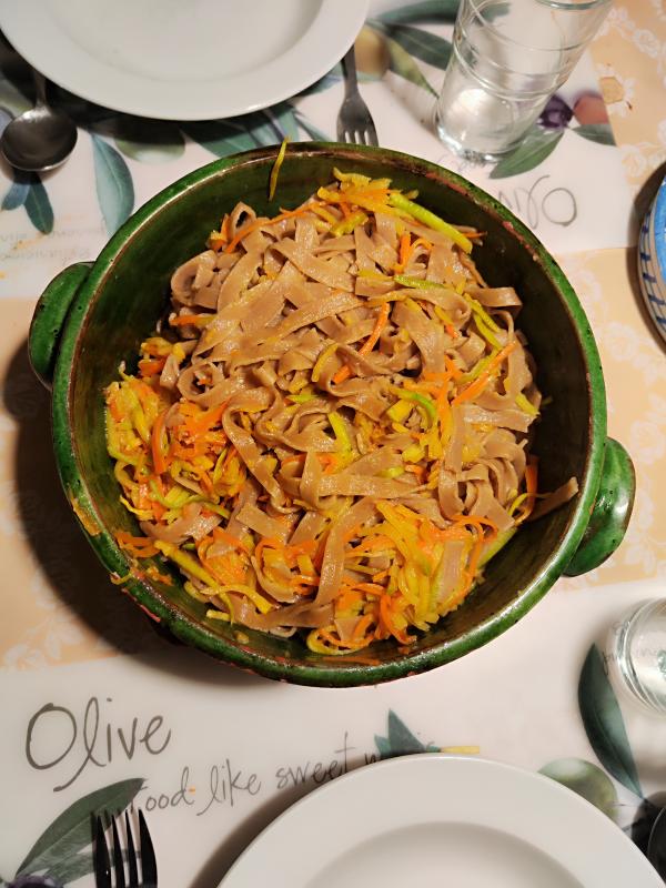 GG bekommt den Rest Ochsenbacke mit Wurzelgemüse, für mich Nudeln mit Ratatouille