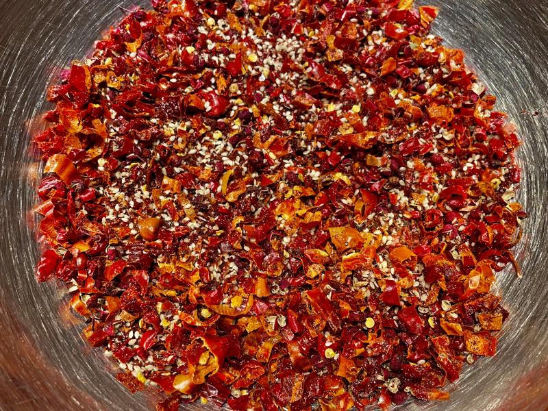 hier gibt es demnächst die neueste charge hausgemachtes chinesisches chiliöl, mit gartenchilis und gartenszechuanpfeffer