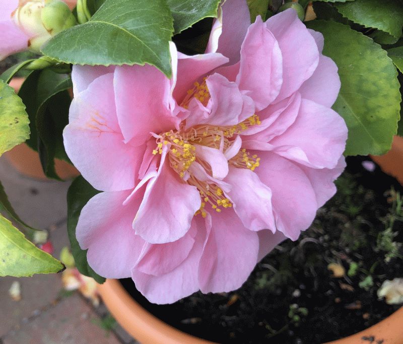 Ich glaube, die gehört hierher. Der uns übergeholfenen Kamelie scheint es hier nicht so schlecht zu gefallen. Die Blüte war dieses Jahr nicht besonders üppig, dafür aber der Zuwachs und der Knospenansatz. Bisl Luft ist noch bis zur Decke.