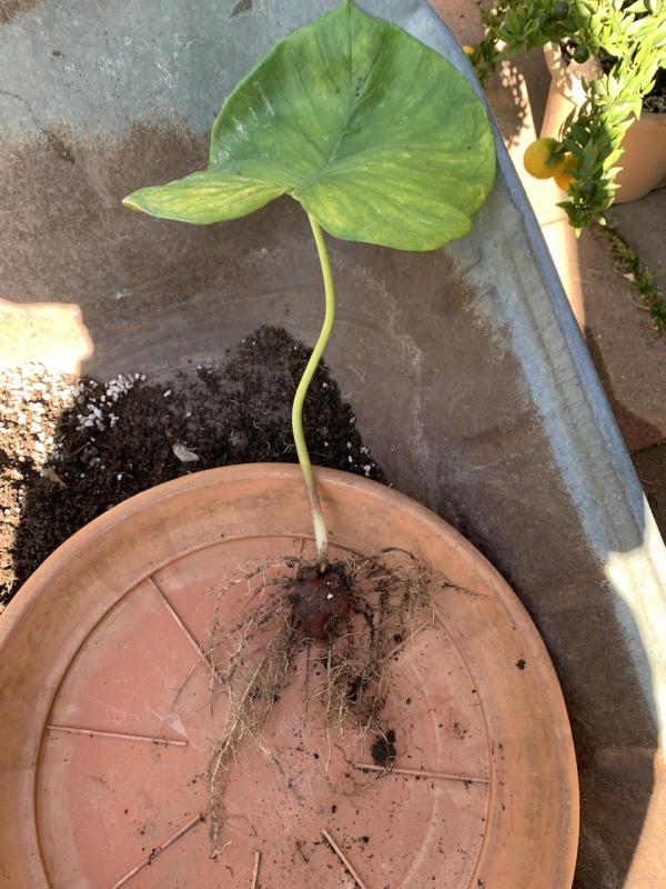 Unter die Sprösslinge hat sich die gefragte Pflanze geschummelt. Habe sie gleich getopft und das Blatt ist bisher noch nicht eingezogen. Auffällig ist die kräftige Farbe der Knolle.