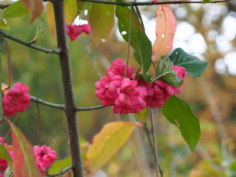 Die Pfaffenhütchen sind gerade sehr schön, sehr schön fruchtende Exemplare könnte ich ja mal gezielt locker verteilt pflanzen.