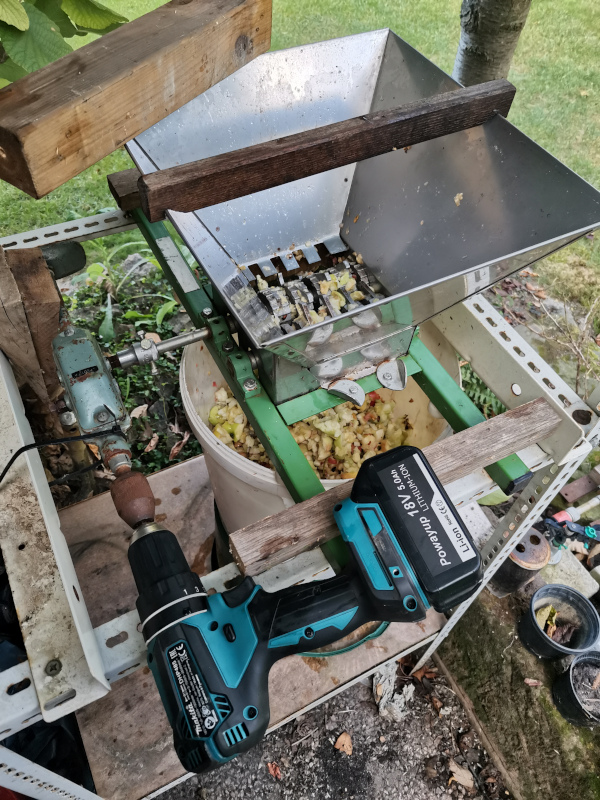 Für Pressen gibts Möglichkeiten, der Knackpunkt ist mehr die Obstmühle, da scheint es nicht so gangbare Eigenlösungen zu geben. Gewiss, einen Motor an eine gekaufte Handmühle anzuschrauben, das geht, nur eine recht begrenzte Selbstbautätigkeit. Ich hab vor meiner jetzigen Obstmühle eine Küchenmaschine mit mittelgrober Raspelscheibe benutzt, manche Geräte haben einen überraschend guten Durchsatz. Viele aber auch nicht, mit der alten Maschine waren >10 Raumliter pro Stunde drin, die jetzige ist konstruktionsbedingt für diesen Zweck eine Gurke. Und eben alles kein Selbstbau.