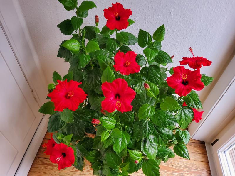 Meine Hibiskus-Sammlung ist inzwischen angewachsen. Im Sommer stehen sie auf der Terrasse mit Nachmittagssonne, und wenn ich sie im Herbst reinhole, werfen sie meist erstmal mit Blättern um sich. In diesem Jahr passte der Zeitpunkt anscheinend, und sie erfreuen mich mit vielen Blüten.