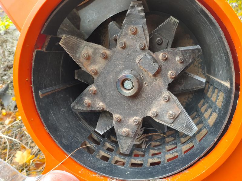 Ich Langarm-Mensch erreiche im Stillstand die Messer, also darf ich nur mit Werkzeug nachstopfen, einem Holzprügel. Wenn man sieht wie der von den Messern zerfasert wird halte ich auf jeden Fall meine Finger raus. Es sind zwei Messerkränze mit je 6 rasiermesserscharfen Messern die angeblich Äste bis 3cm Dicke kleinhacken können.