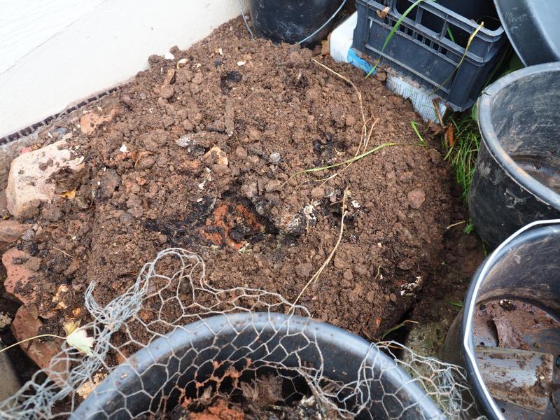die unreife Komposterde. Die ruht bis zum kommenden Jahr und wird mit Laub bedeckt. Ich habe 6 Töpfe mit 25 l geerntet. Die Töpfe stehen auf Erde und Regenwürmer werden einwandern um den Rest zu erledigen.