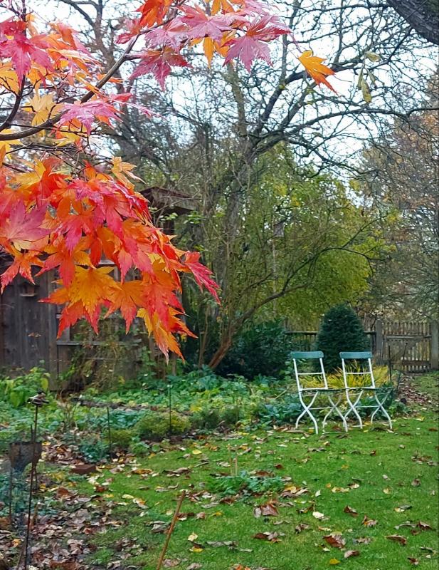 Garten mit den laubbedeckten Flächen, den ergrauten Stauden und den vielen Gehölzen ist zu jeder Jahreszeit einen (virtuellen ) Rundgang wert.