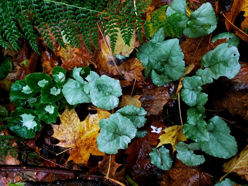 Da im Wald auch niemand Laub fegt, würde ich auch meinen, dass Cyclamen und Co. durchaus gut mit einer Laubdecke zurechtkommen, vielleicht ist der gelegentliche Riesenwuchs bei den Blättern sogar darauf zurückzuführen, dass sie aufgrund des Lichtmangels halt einfach mehr Blattmasse bilden, wenn die Stängel nicht ausreichend in die Länge wachsen können, um das Laub besser ans Licht zu bringen. Ganz allgemein sind insbesondere die Herbstalpenveilchen ja erstaunlich genügsam und robust. Letztes Jahr hatte ich auch so ein Exemplar mit ein paar großen Blättern, dieses Jahr sieht es wieder normal aus.